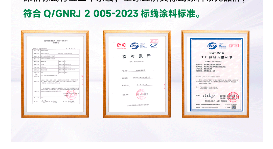 ?專(zhuān)家測評:標線(xiàn)特點(diǎn):優(yōu)質(zhì)苯丙基料、金紅石鈦白/有機鉻黃顏料、多重優(yōu)質(zhì)助劑、復合工藝、標準化檢測;色澤好、覆蓋強、宜施工、不起泡,耐磨耐候、品質(zhì)一致性好;執行標準:中國交通部Q/GNRJ 2 005-2023路面標線(xiàn)涂料標準;